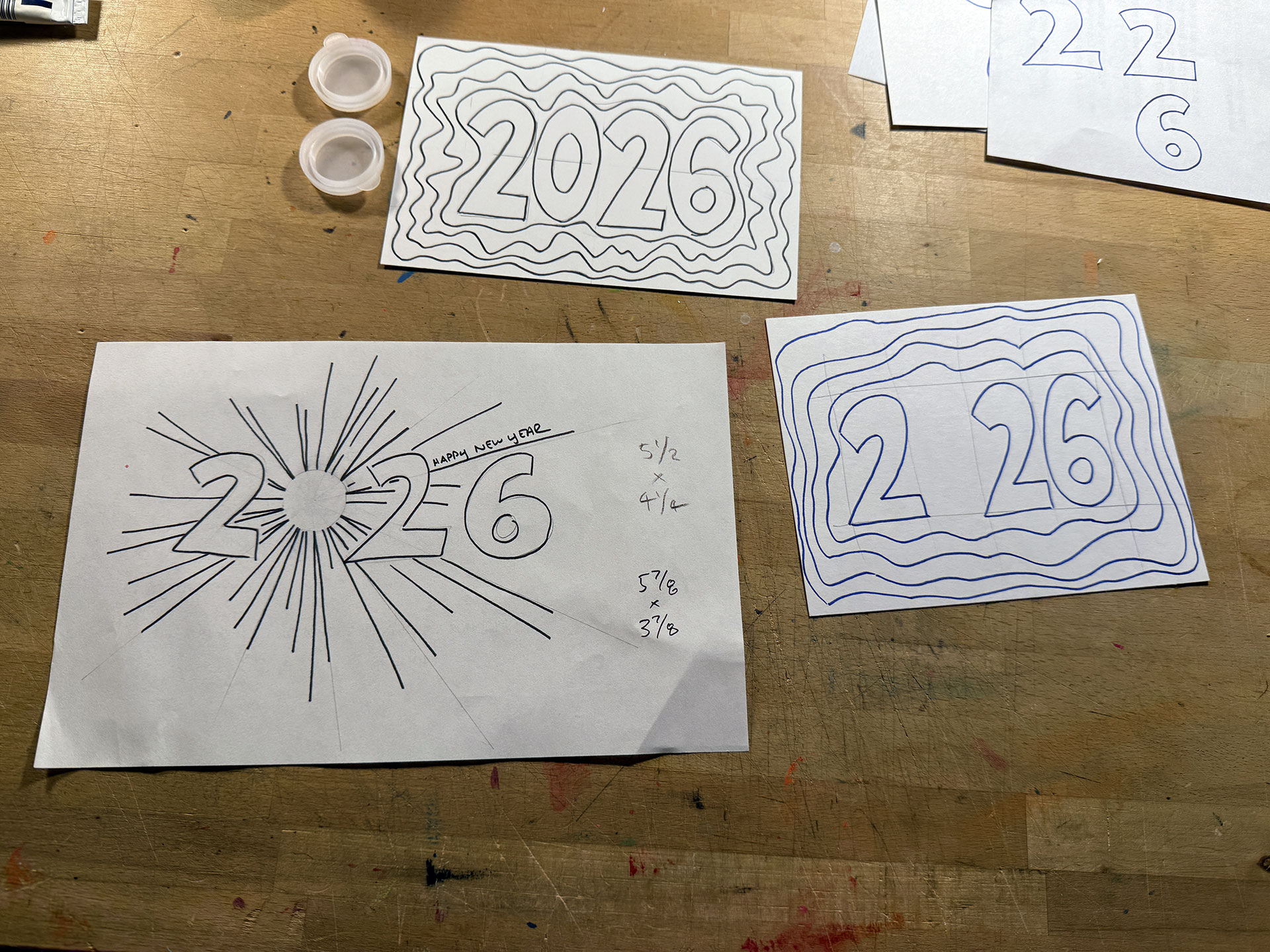 Around my mother’s birthday–which occurs in early December and is the last birthday on my recipients list–I begin worrying, er, thinking about what I’m going to do for the two prints (Happy New Year and Happy Birthday) I create each year. The 2023 Happy New Year print was well received (and it’s one of my favorites as well), so I spent some time looking for inspiration in the 2026 zodiac (the year of the Horse) but couldn’t find anything that I liked or thought I could pull-off. Then, I played around with a sort of Great Gatsby/Art Deco design, but decided that it was something that I’d have a hard time pulling-off. Eventually, I found something that interested me, and the sketches I made led me to incorporate a technique that I used to play around with back when I first started drawing and painting.