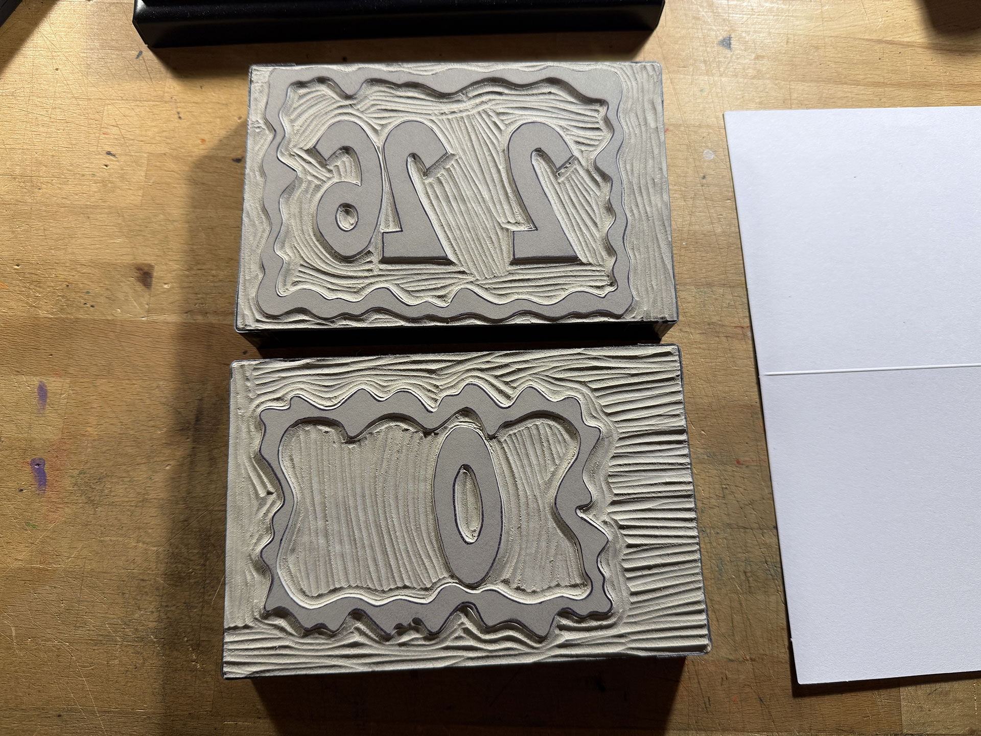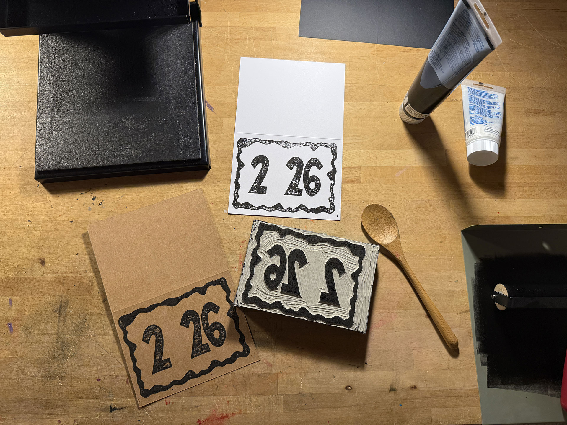 The design for the card was super simple, as there were no intricate parts besides the edges of the numbers, which was a nice change of pace. The plates were carved relatively quickly and a test of the first plate looked good. However, for some unknown reason that I still can’t grasp, I neglected to test-out the second plate to see how it would all fit together. Maybe, after the previous four years of doing these prints, I figured it wasn’t necessary, but I was wrong.