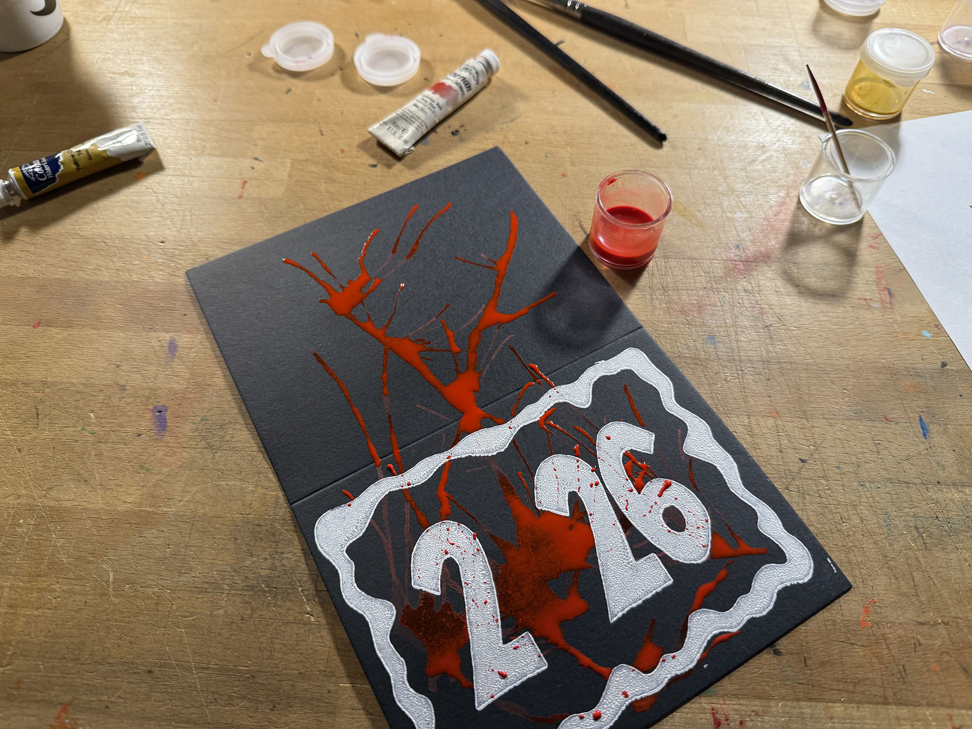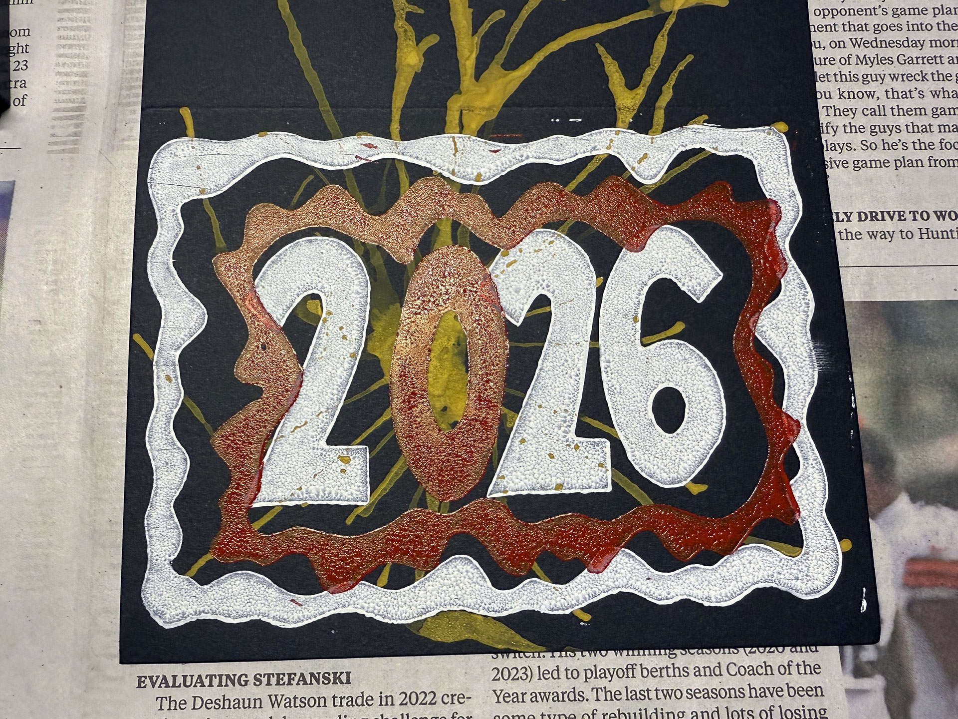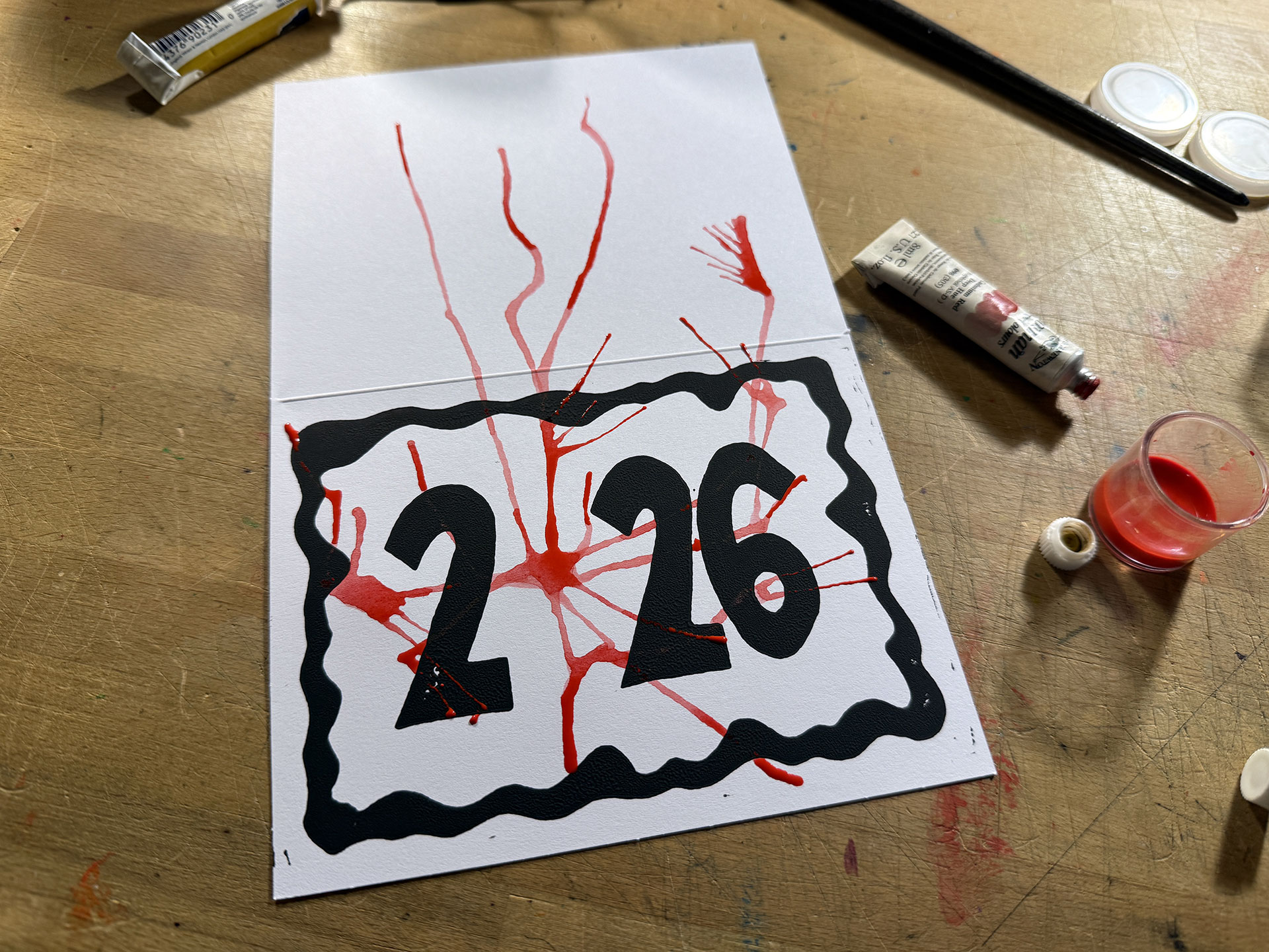 This isn’t anything revolutionary or something that I invented, but, when I got into drawing and painting, one of the first techniques I enjoyed was blowing blobs of watercolor paint or ink around on paper to create weird designs and effects. (Here are a handful that I dug-up from my archives.) The idea I came-up with for the card involved replacing the zero in “2026” with a wind-blown blob, which eventually evolved into a concept that would involve three layers: