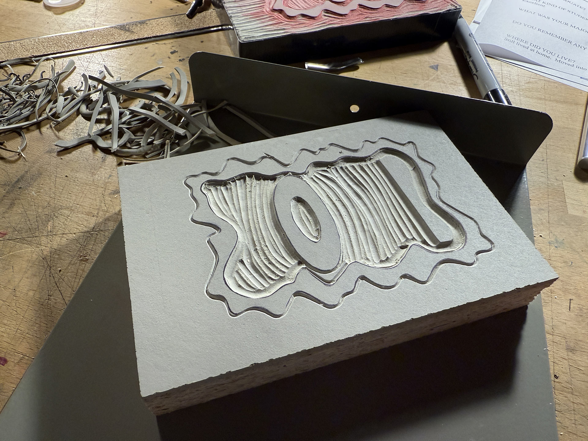 This left me with a decision to make: keep trying and see if I could eyeball the adjustment, or redo the second plate. If this had been one of my previous year’s designs that had more complex angles and details to carve-out, I may have gone with the former option. But, given how simple this design was (and the fact that I’d just replenished my supply of linocut blocks), I decided to redo the plate.