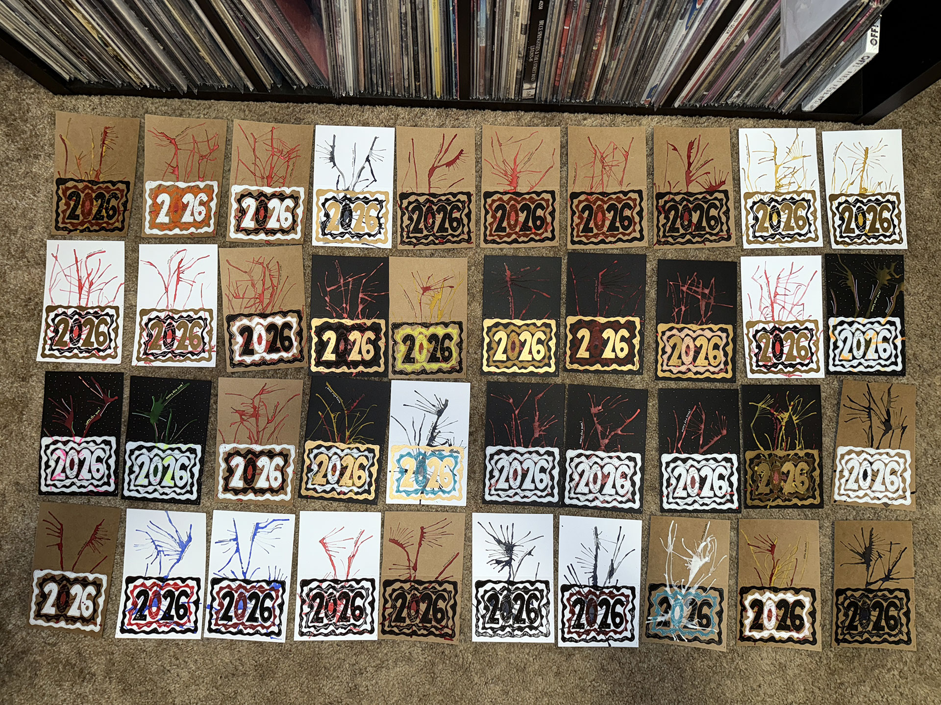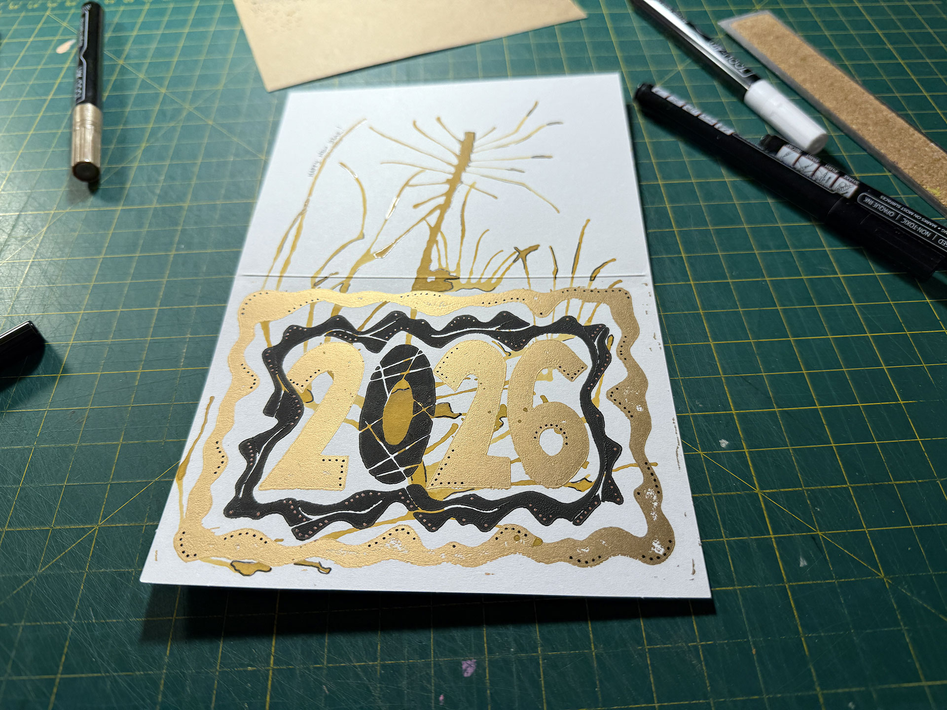 As I did with last year’s prints, I used my acrylic paint pens to enhance the final prints, while I added the “Happy New Year” inscriptions and used a pen to outline bits of the watercolor layer. This step took the most time of any other in the project. As usual, I started-off just adding a bit here and there, but, about a quarter of the way through, I was enhancing this shit out of every card. The final cards were beautiful and every one was truly unique, but it starts to defeat the purpose of mass-producing something when so much effort is put into each individual piece.
