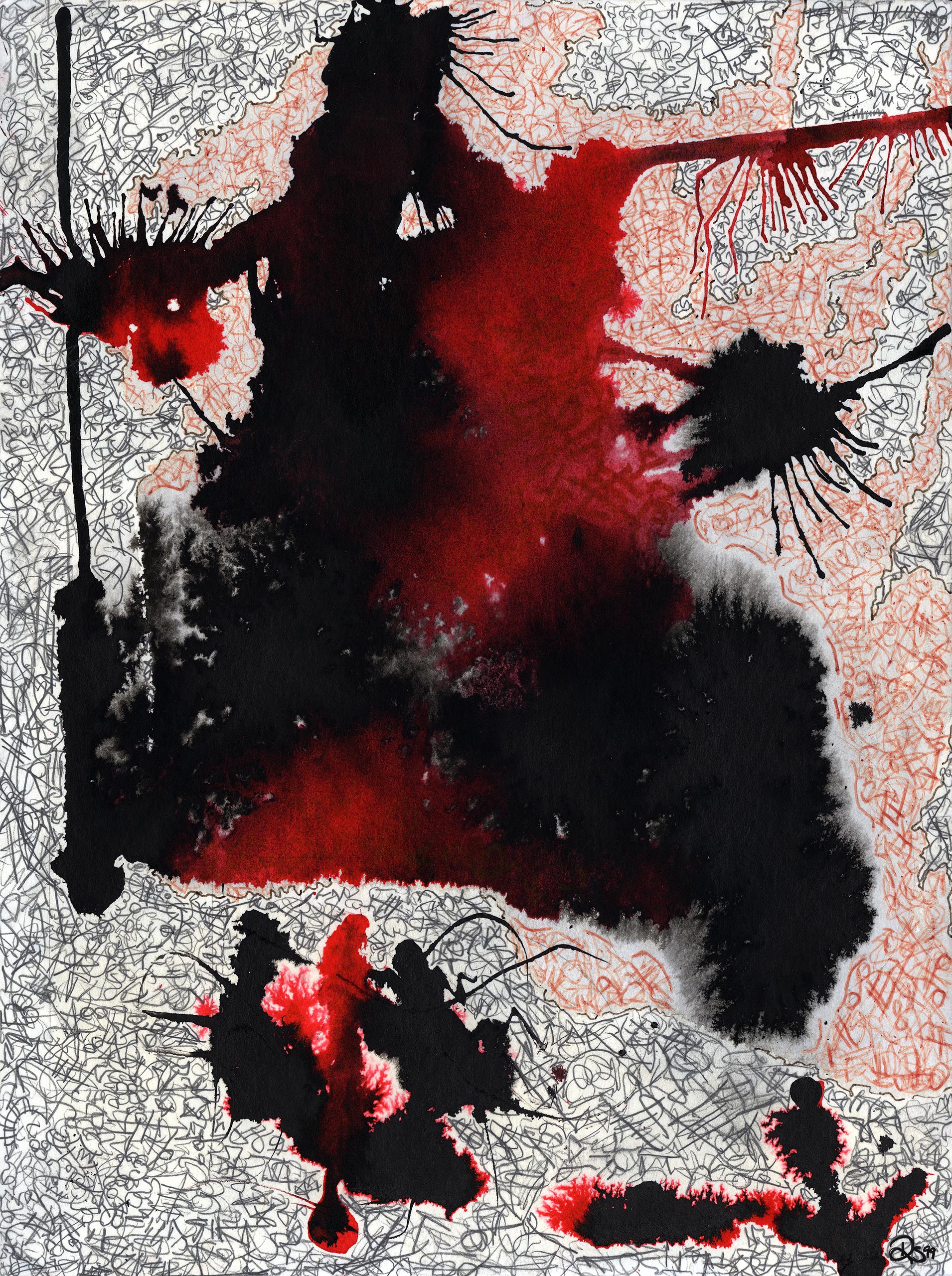 scribblingwind-blown inkpenswatercolor paper blackred